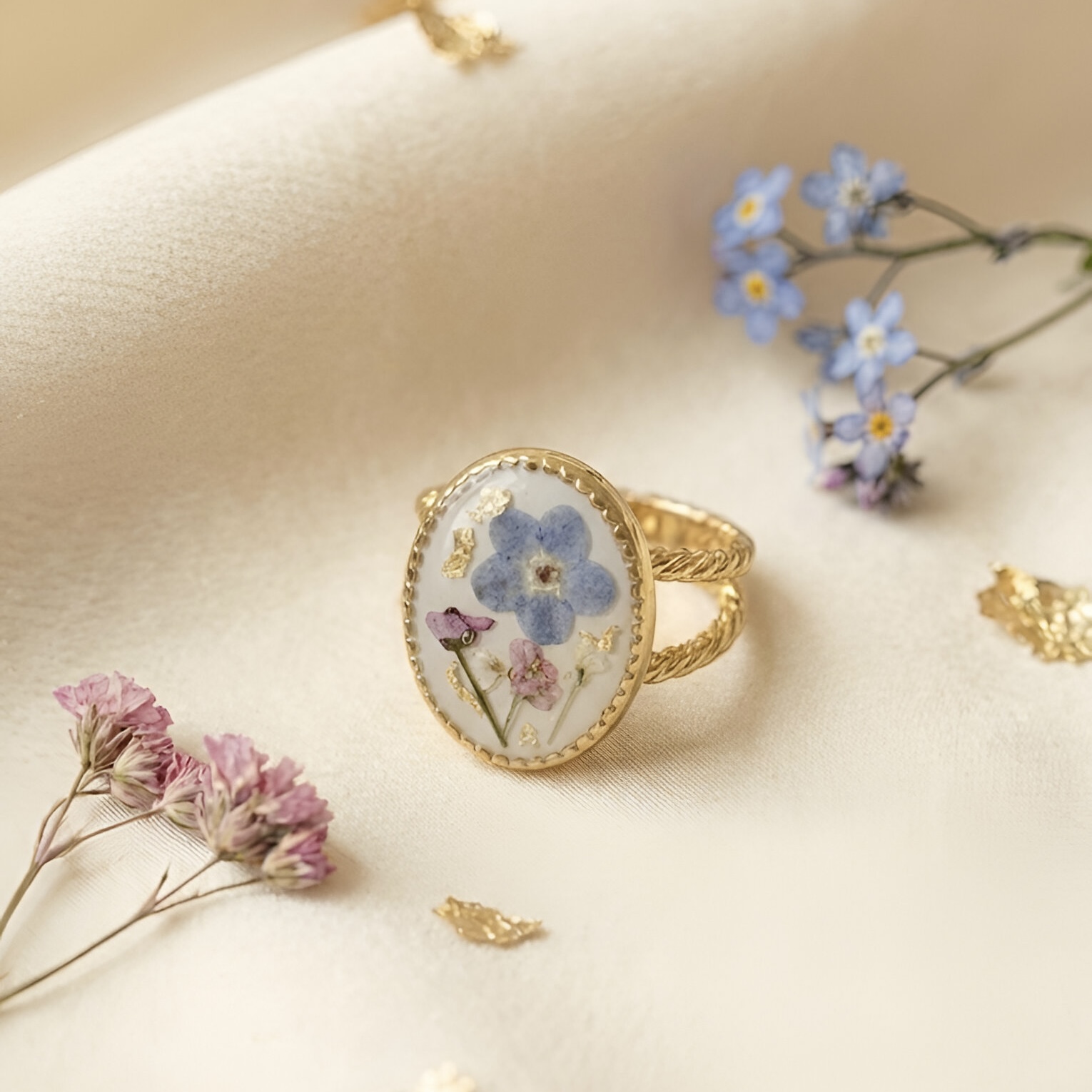 Bague 8×10 ovale blanche fleurs de myosotis et fleurs roses et feuilles d’or