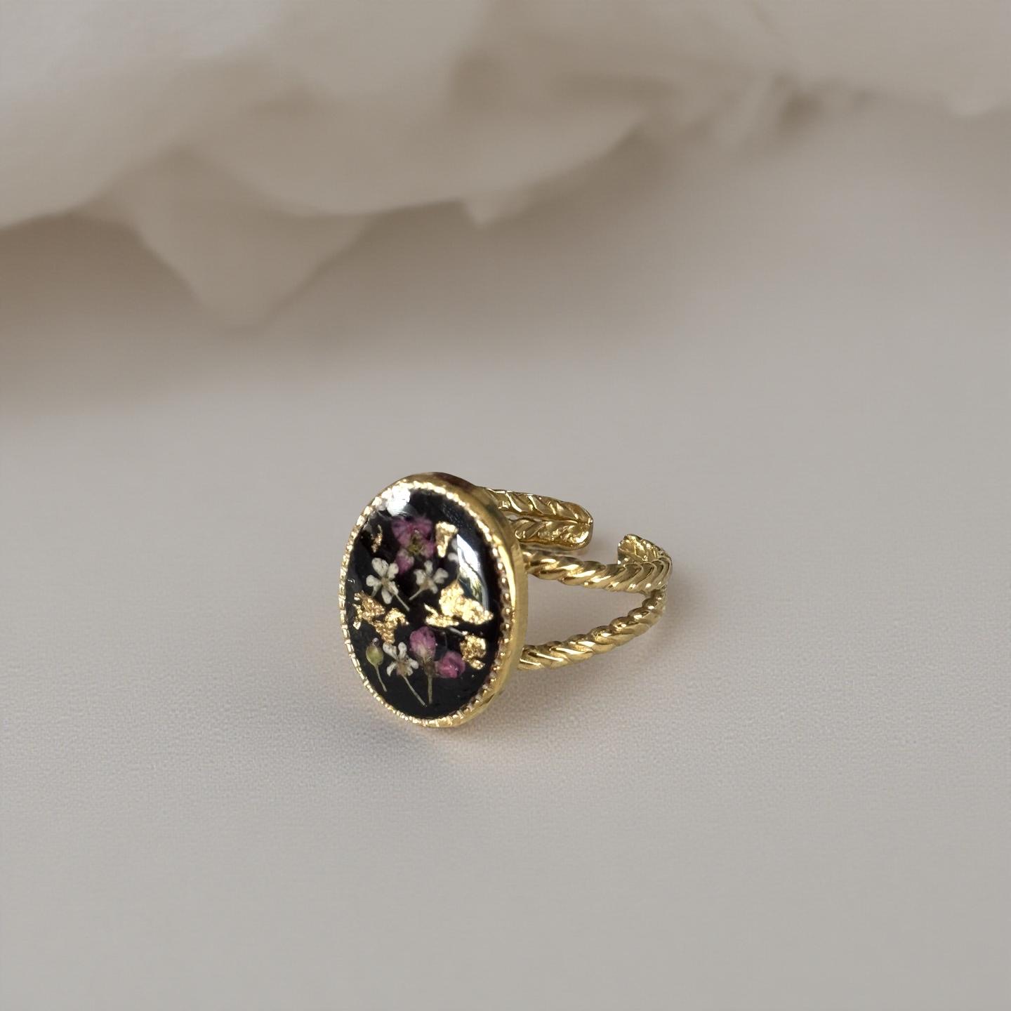 Grosse bague rétro noire fleurs séchées roses et blanches Et feuilles d’or
