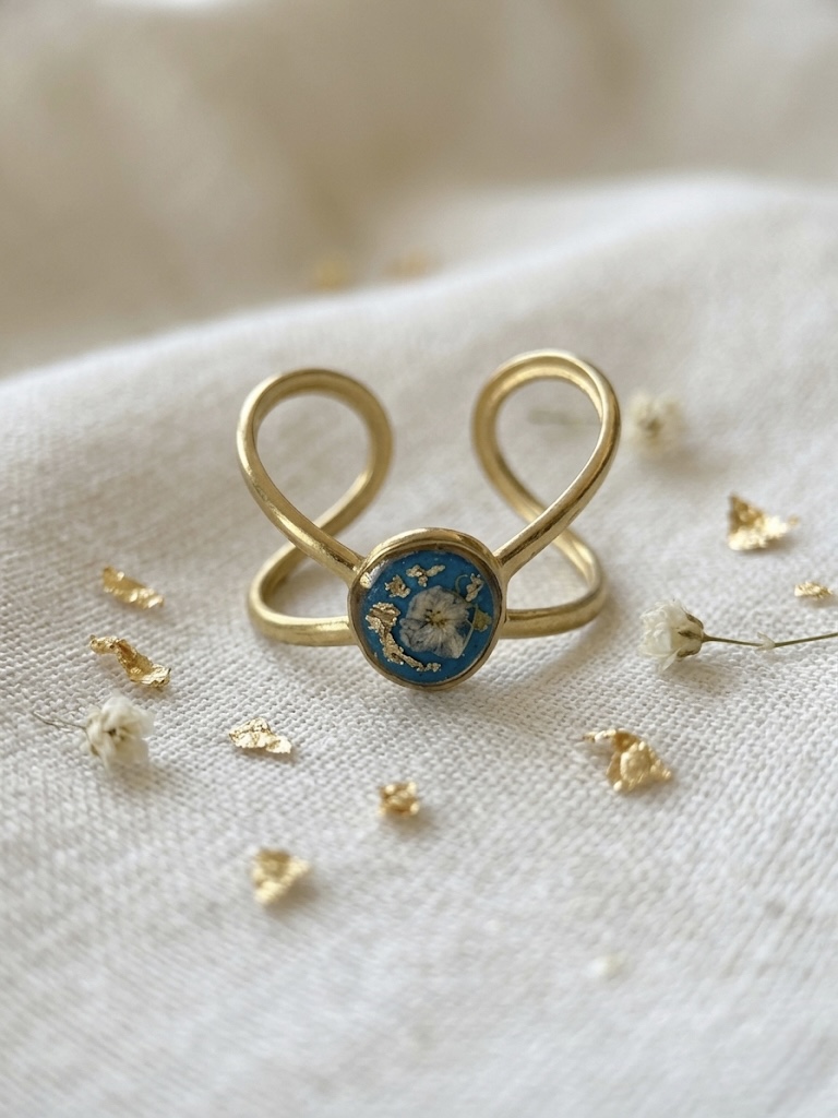 Bague bleue 6mm fleur séchée blanche et feuilles d’or