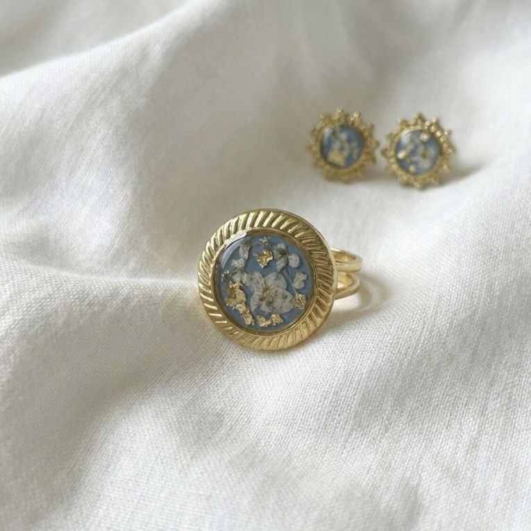 Bague ronde bleu turquoise et fleurs séchées blanches et feuilles d’or Et acier inoxydable