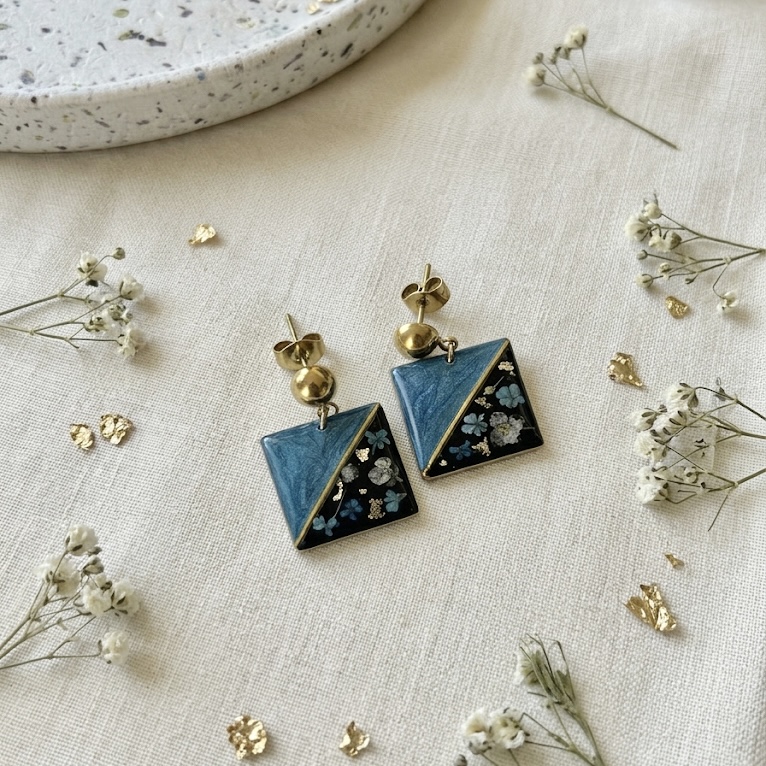 Boucles carrées en acier inoxydable bleues et noires fleurs séchées bleues et blanches Et feuilles d’or