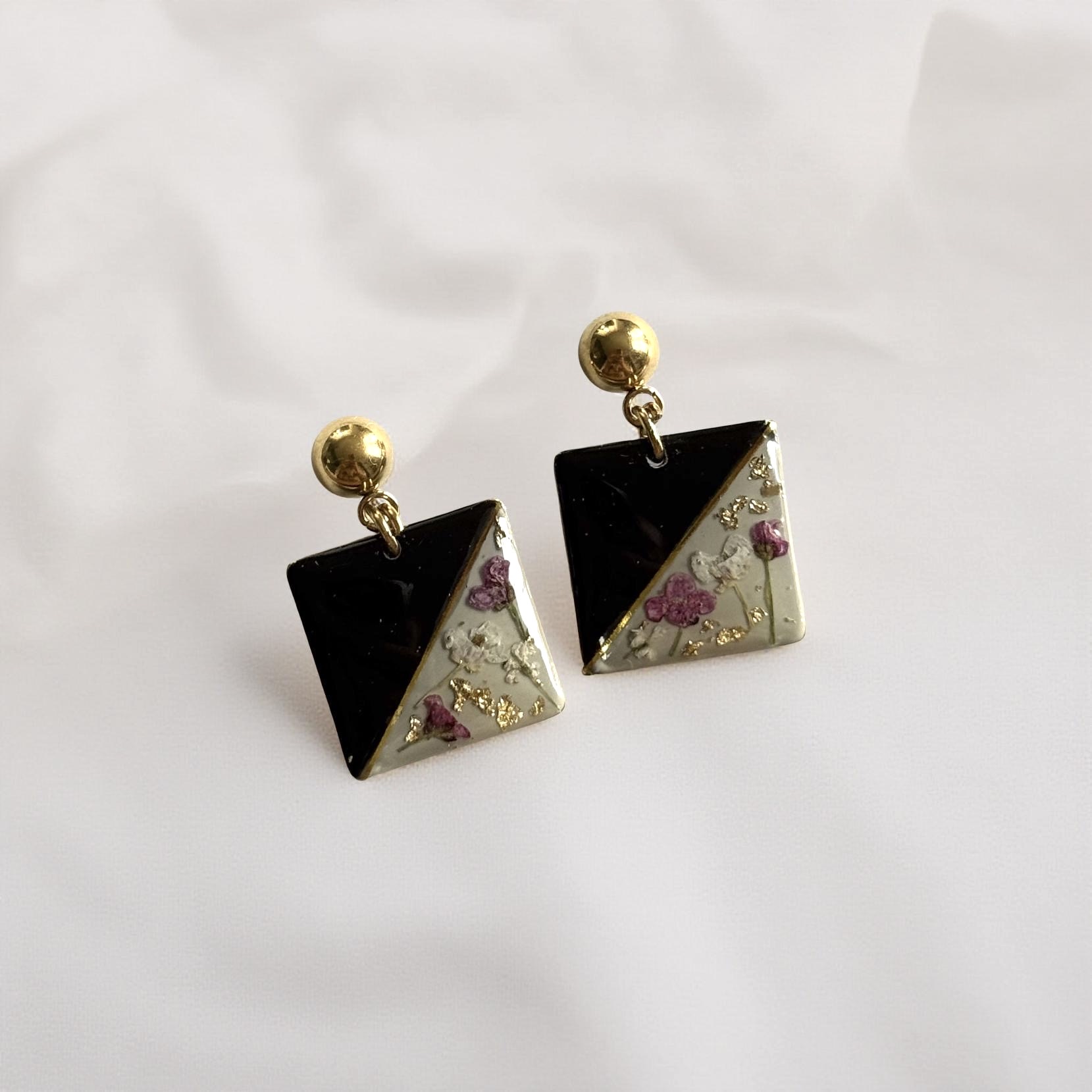 Boucles carrées noires et beiges et fleurs séchées roses et blanches et feuilles d’or