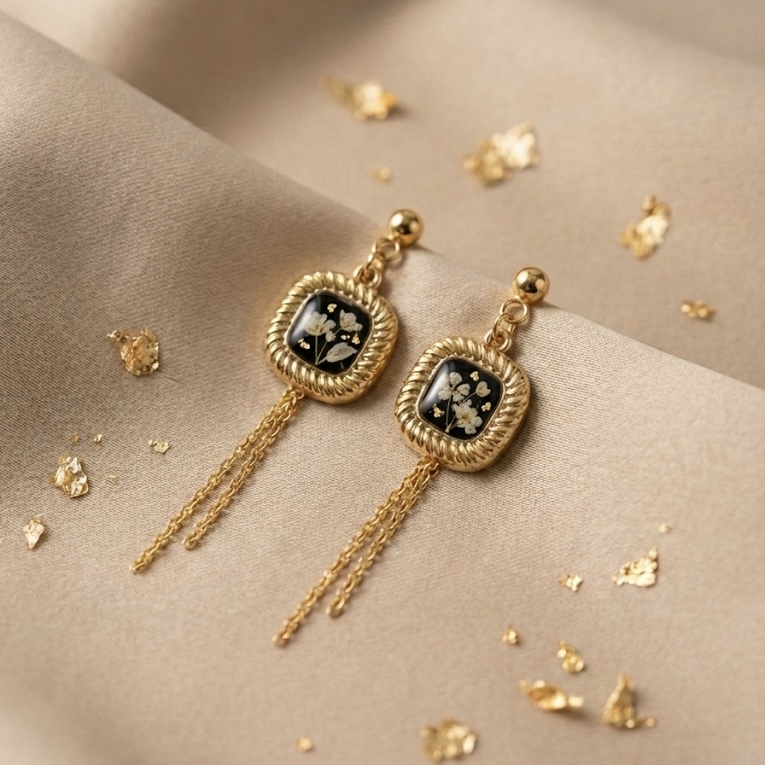 Boucles carrées noires pendantes fleurs séchées blanches Feuilles d’or – acier inoxydable