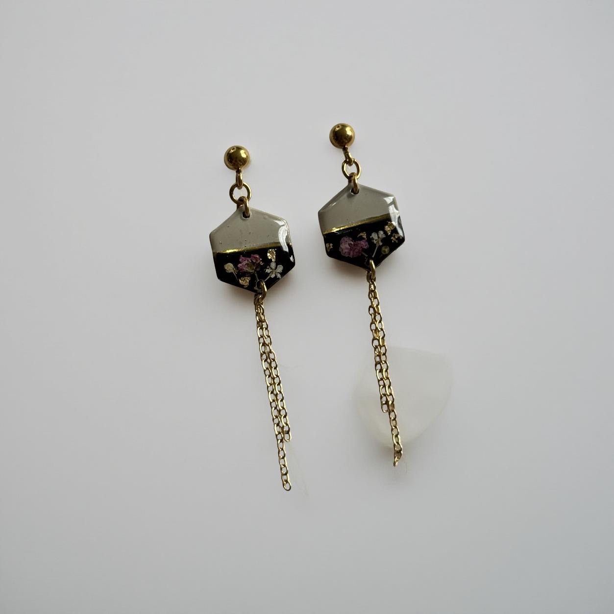 Boucles puces losanges pendantes noires et beiges fleurs séchées roses et feuilles d’or