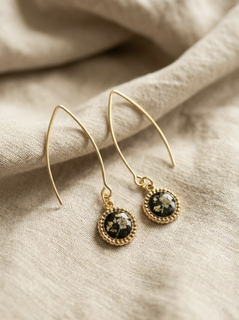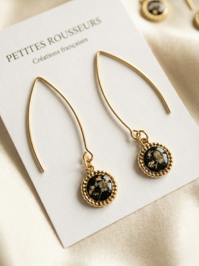 Boucles pendantes rond strié fleurs blanches et feuille d’or