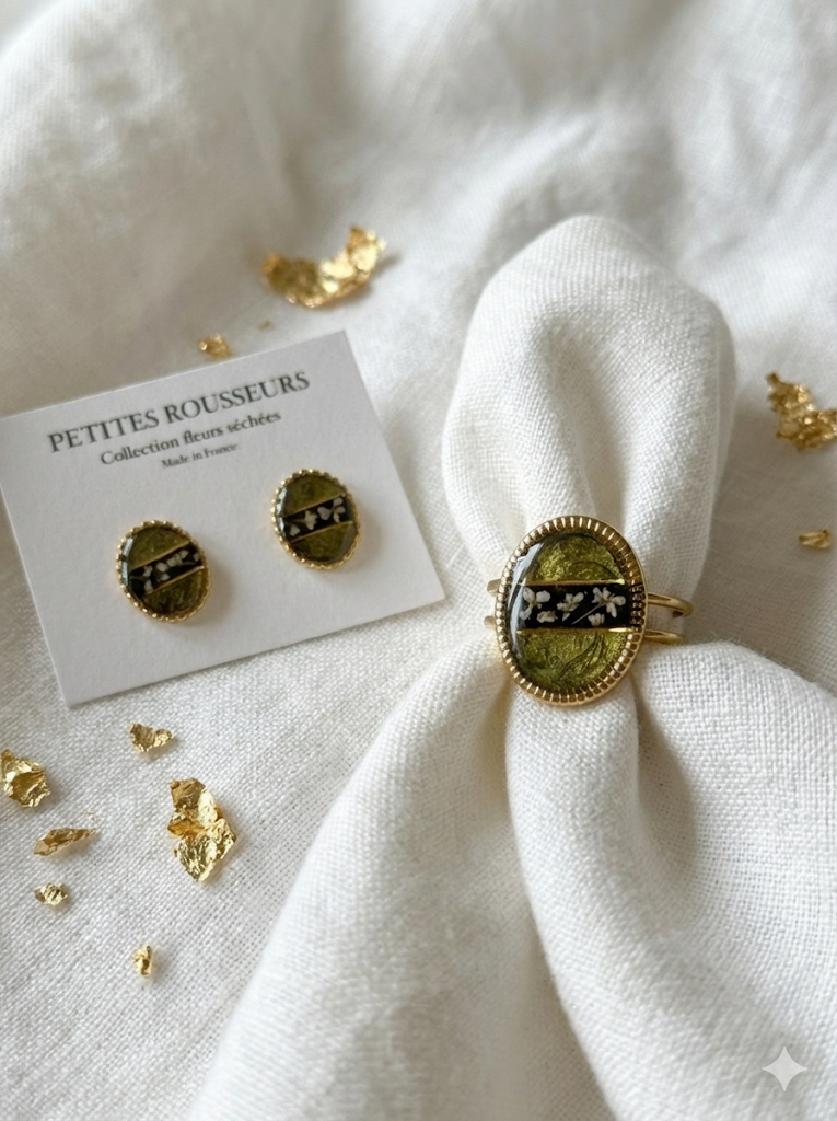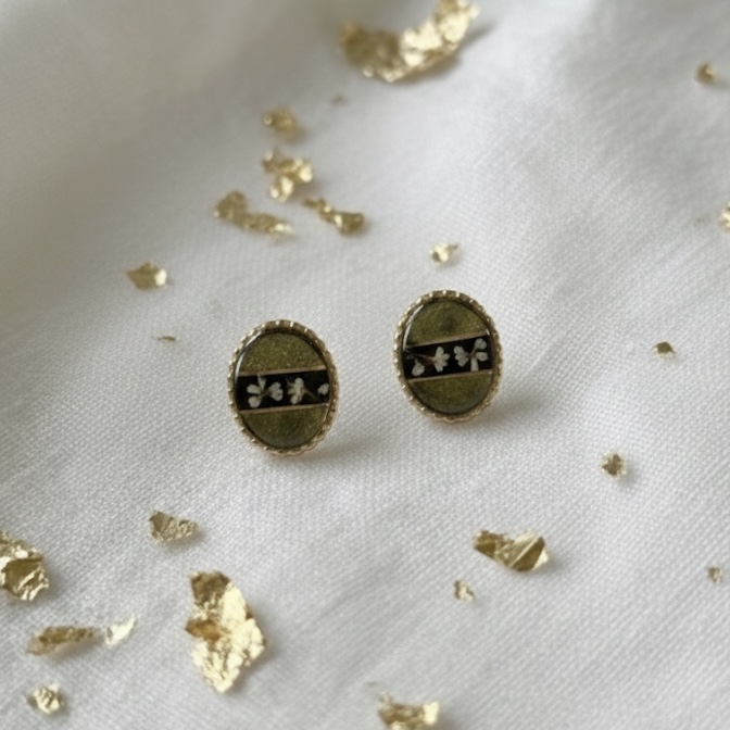 Boucles puces ovales ligne noire et fleurs blanches, feuilles d’or et acier inoxydable