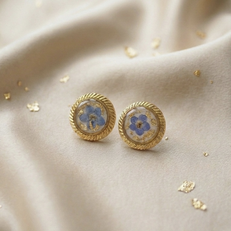 Boucles puces rondes rétro fleurs de myosotis et feuilles d’or