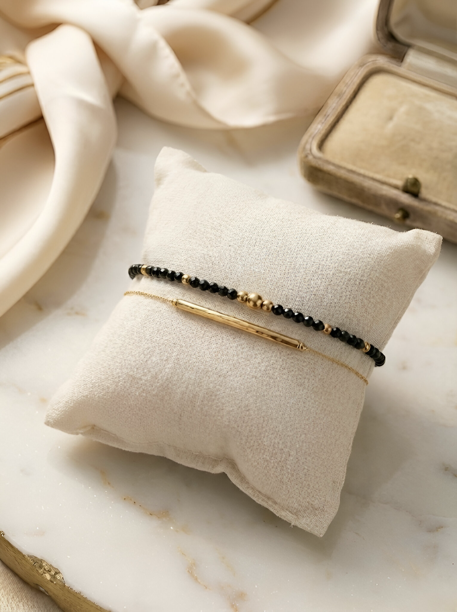 Bracelet double avec tige et petites pierres semi-précieuses noires