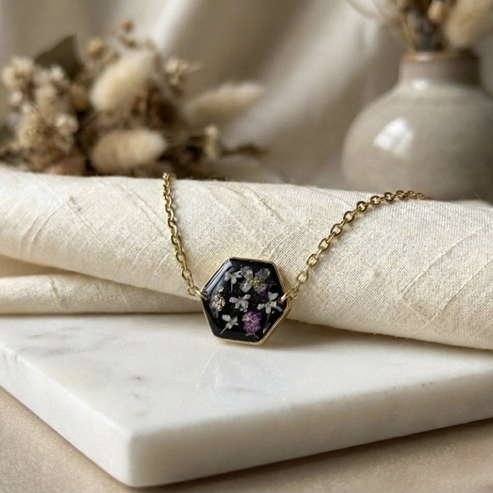 Bracelet noir et fleurs séchées roses lettre personnalisable- Feuilles d’or