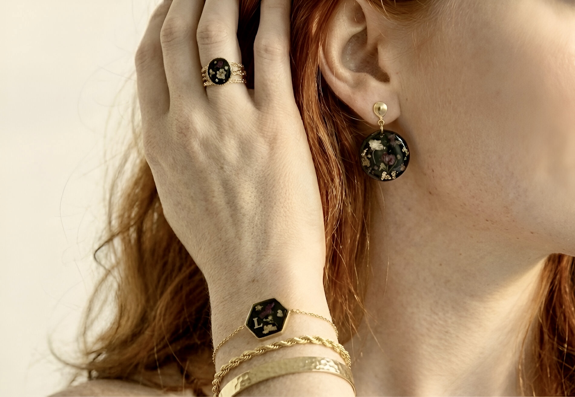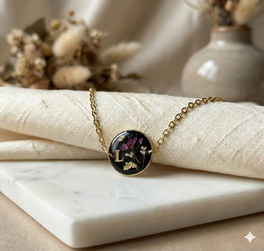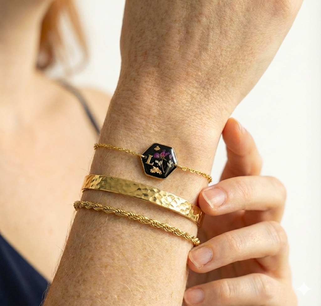 Bracelet noir et fleurs séchées roses lettre personnalisable- Feuilles d’or