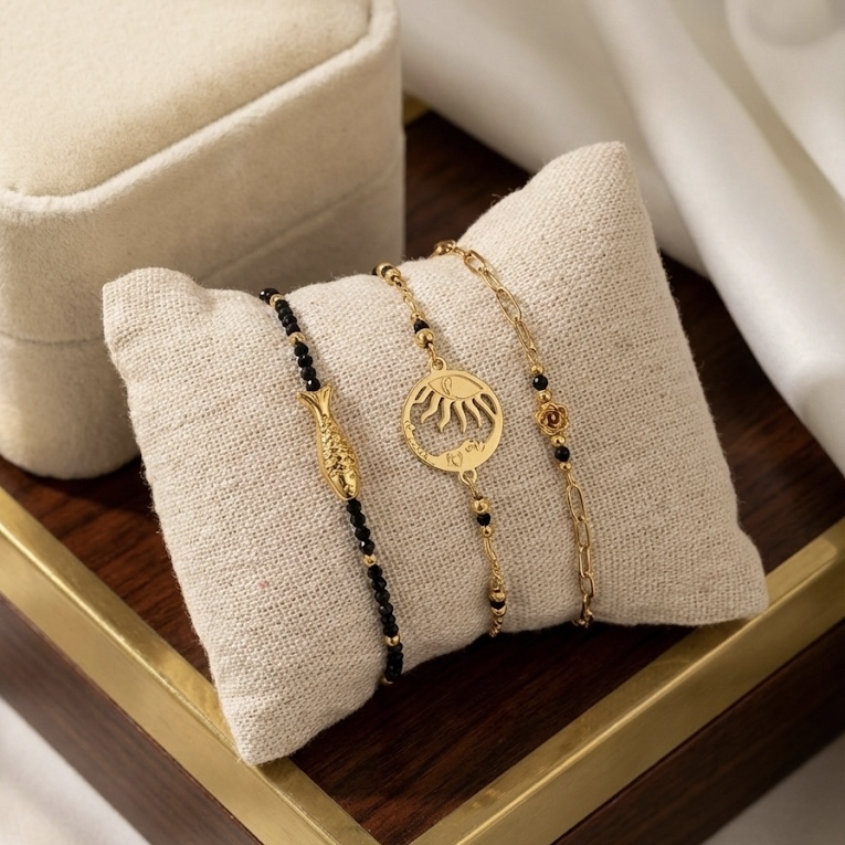 Bracelet poisson et perles noires acier inoxydable – chaîne serpentine
