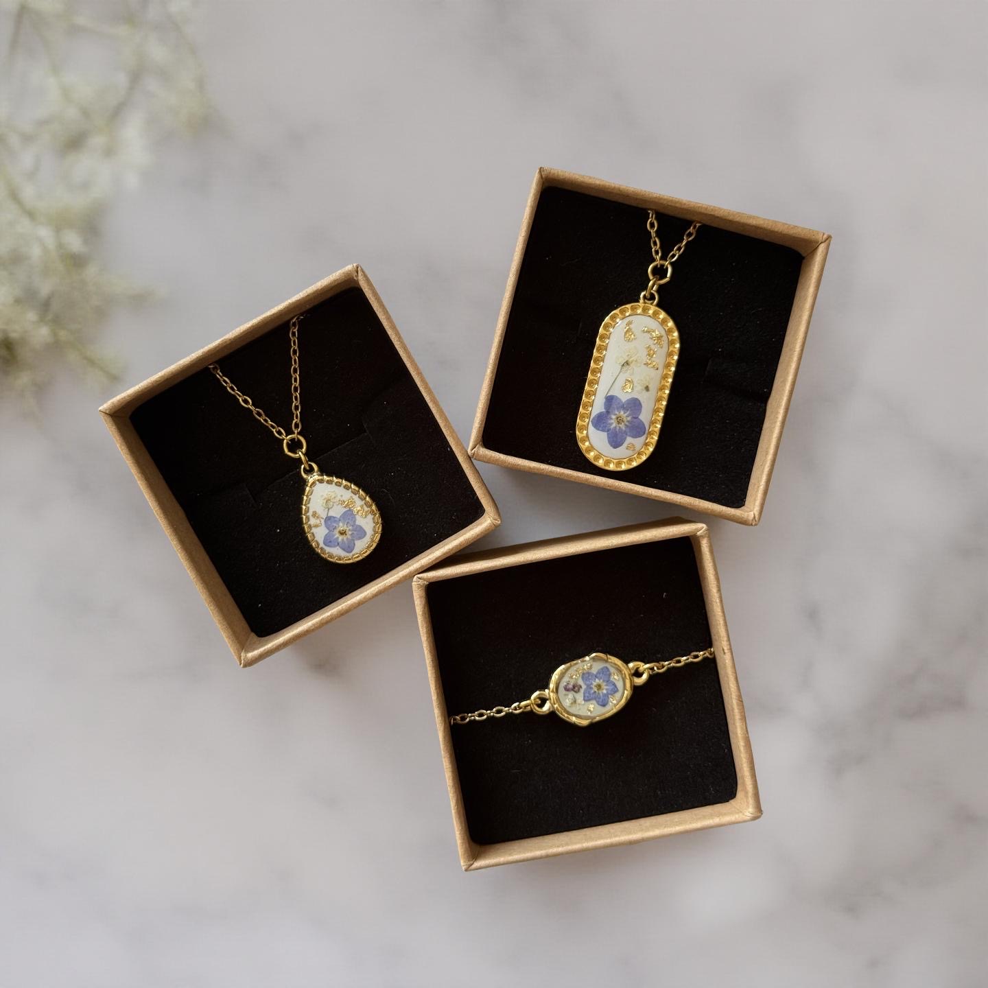 Bracelet rectangle strié – Fleurs blanches et Myosotis- Feuilles d’or