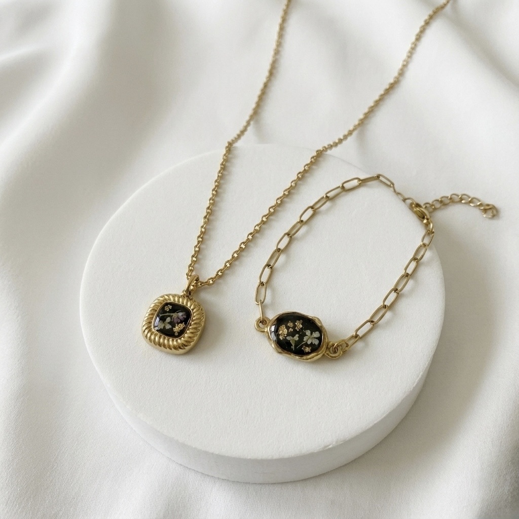 Bracelet rectangle strié noir et fleurs séchées blanches – Feuilles d’or