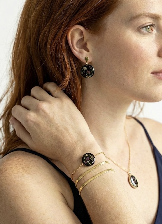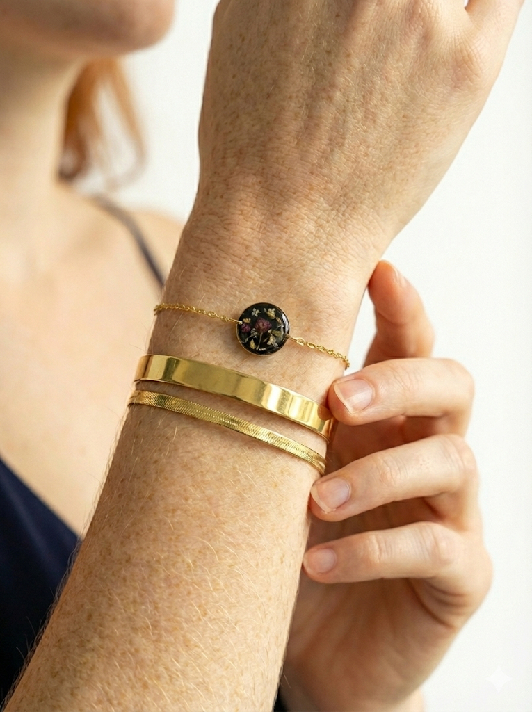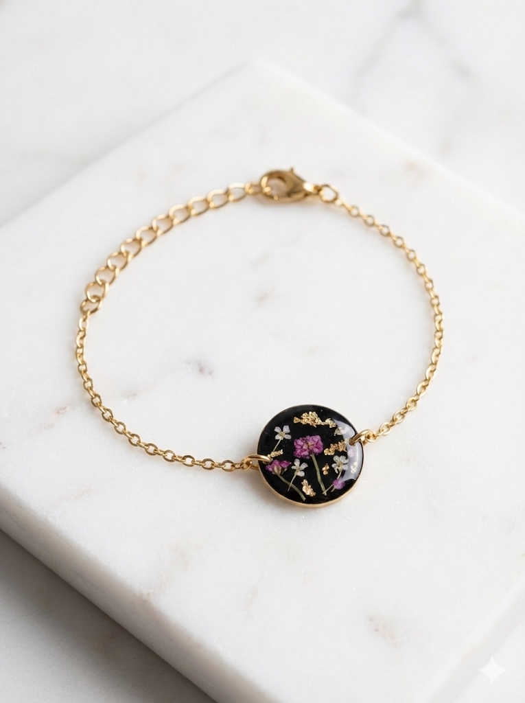 Bracelet rond noir et fleurs séchées roses et blanches- Feuilles d’or