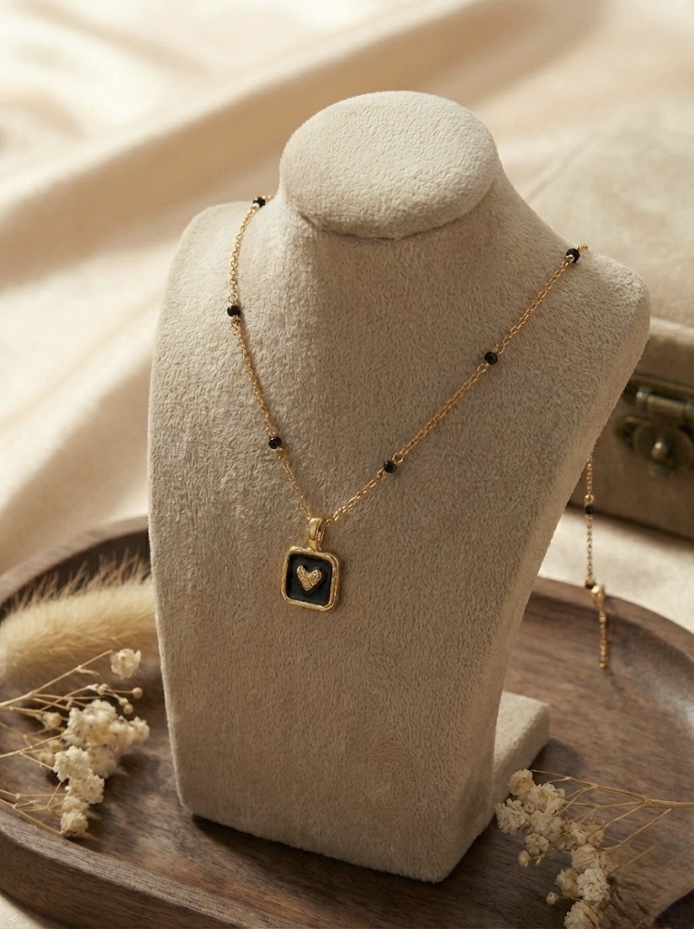 Collier coeur avec une touche de noire avec petites perles en quartz