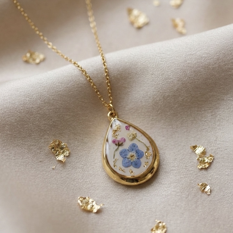 Collier goutte fleurs de myosotis, fleurs roses et feuilles d’or