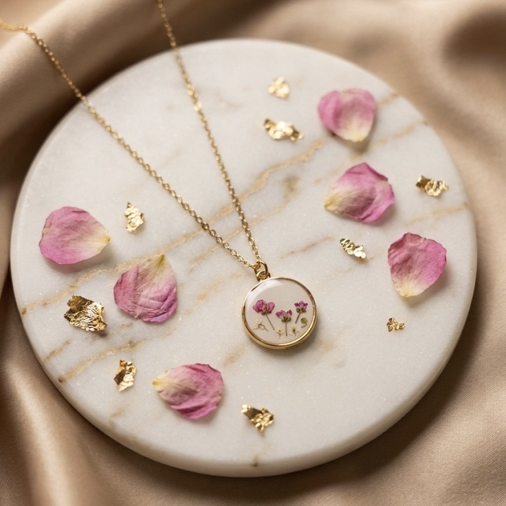 Collier médaillon blanc et fleurs séchées roses et blanches acier inoxydable