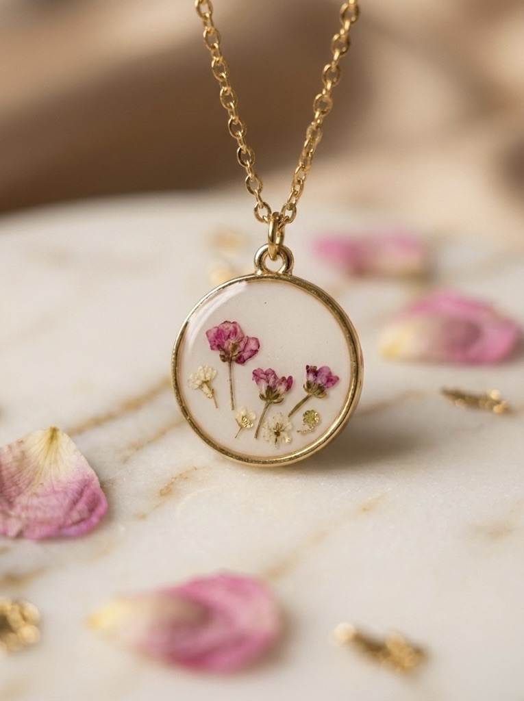 Collier médaillon blanc et fleurs séchées roses et blanches