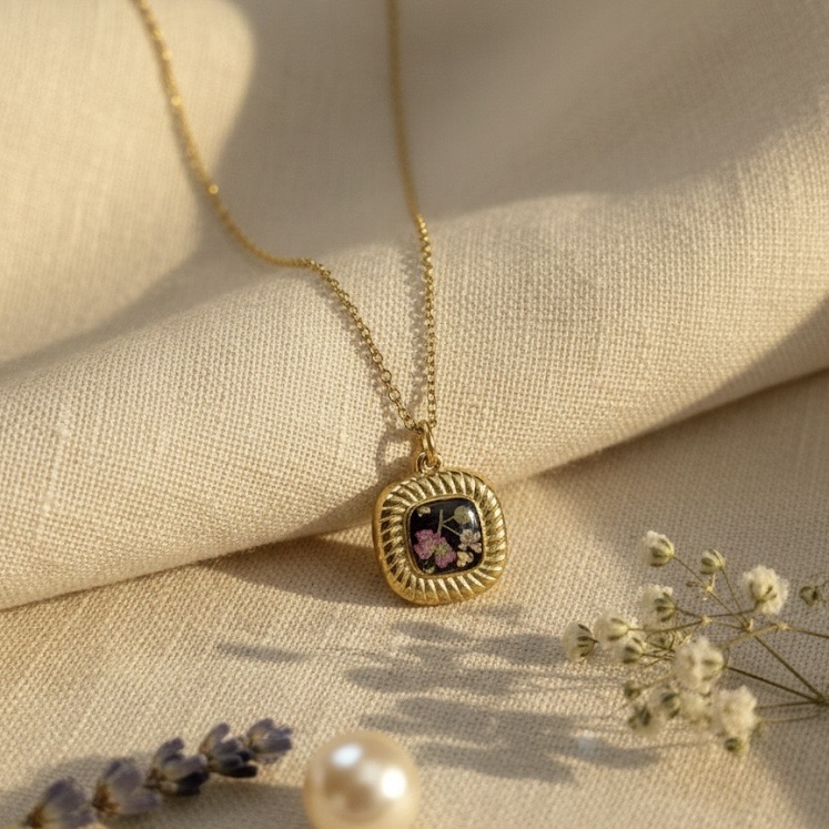 Collier médaillon carré noir fleurs violettes et blanches – Feuilles d’or