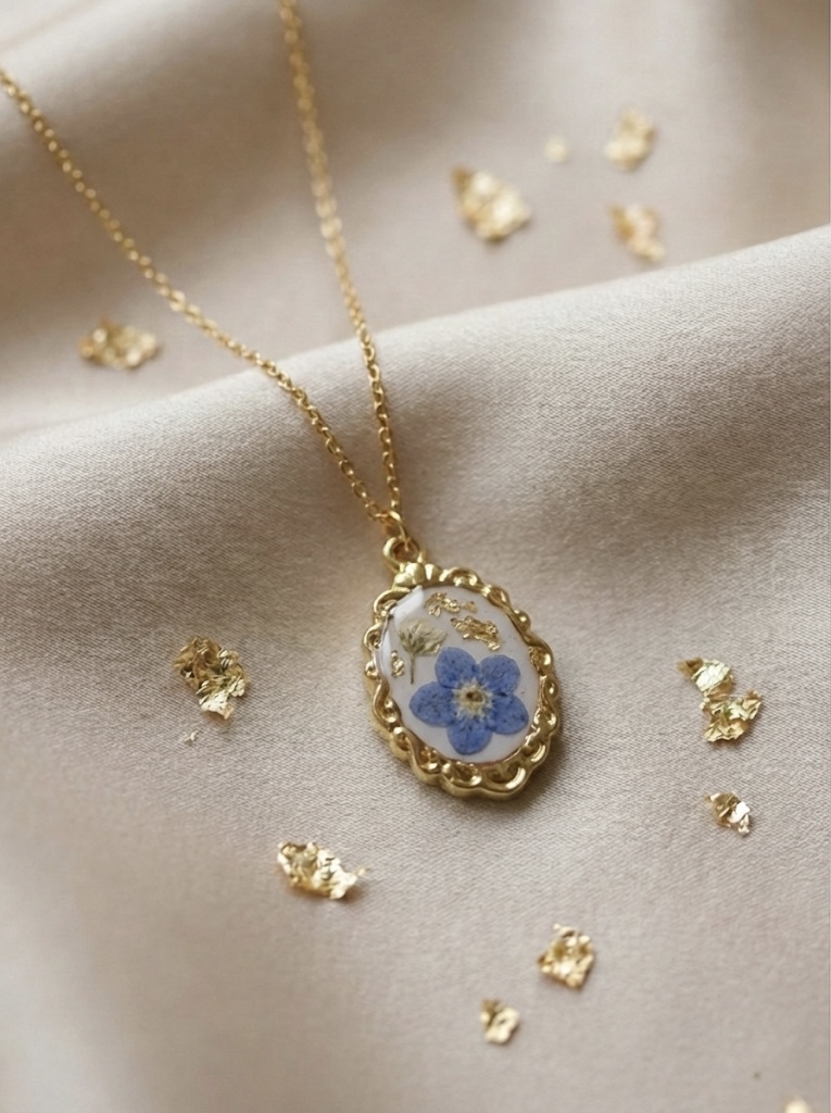 Collier ovale rétro fleurs de myosotis et feuilles d’or