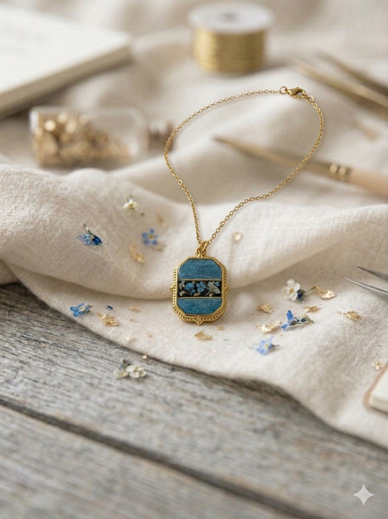 Collier en acier inoxydable rétro bleu et noir fleurs séchées bleues et blanches – feuilles d’or