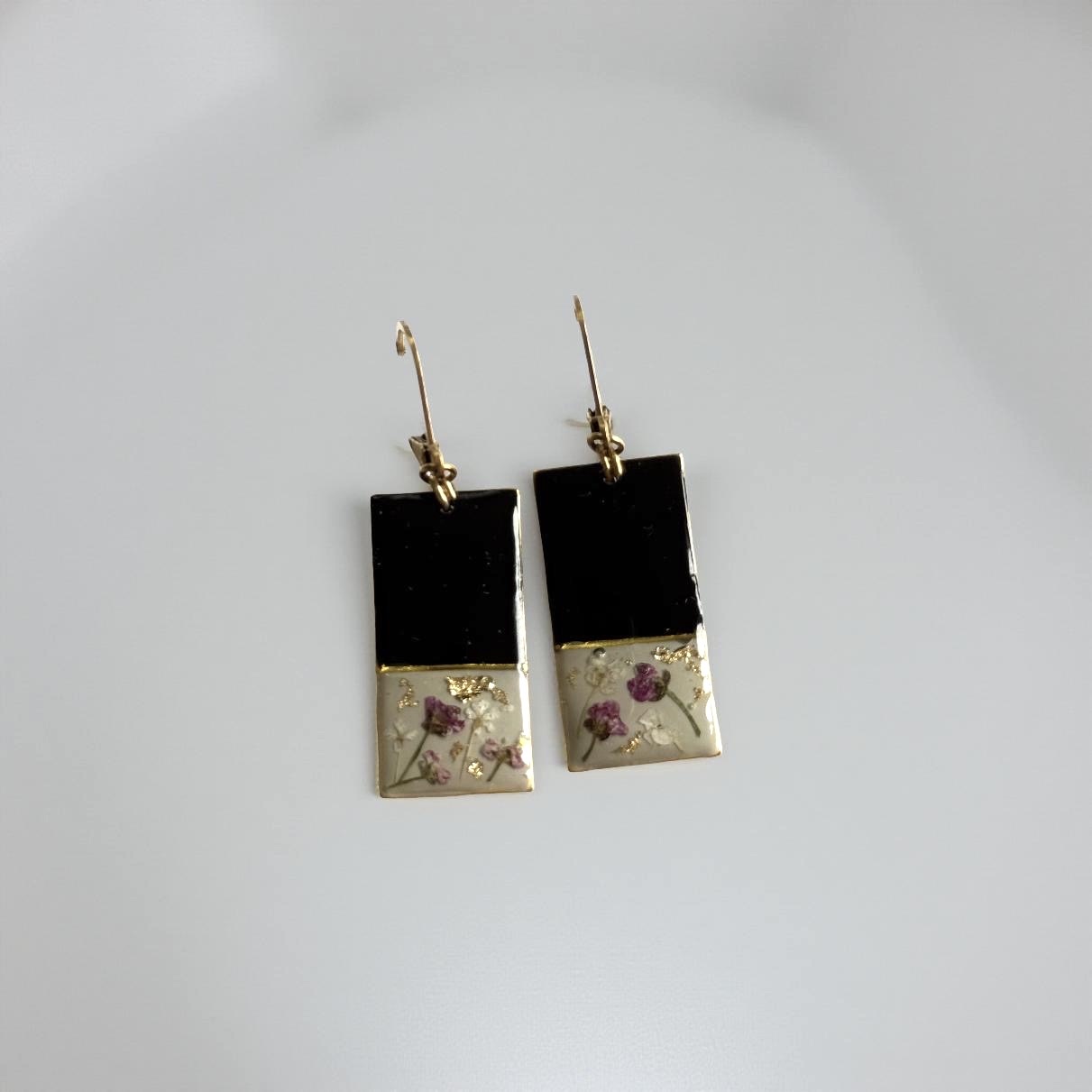 Dormeuses rectangles noires et beiges et fleurs séchées roses et blanches et feuilles d’or