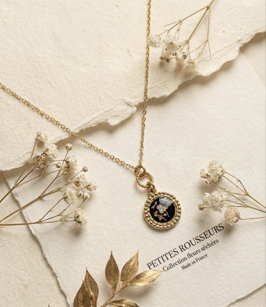 Médaillon et cercle strié noir fleurs blanches et feuilles d’or