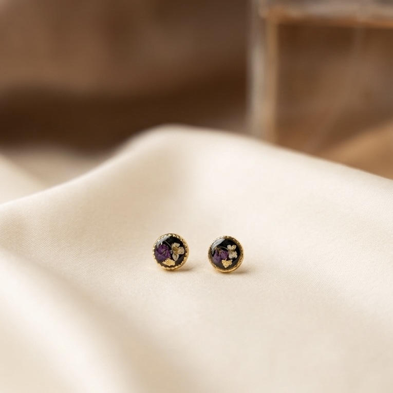 Mini puces noires fleurs séchées Blanches et roses et feuilles d’or