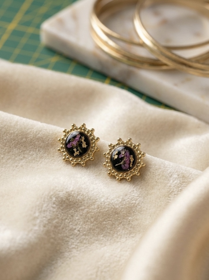 Petites boucles puces rétros noires fleurs séchées Blanches et roses et feuilles d’or