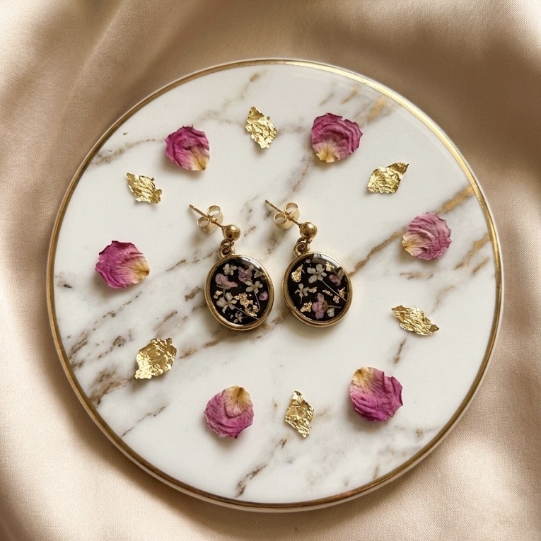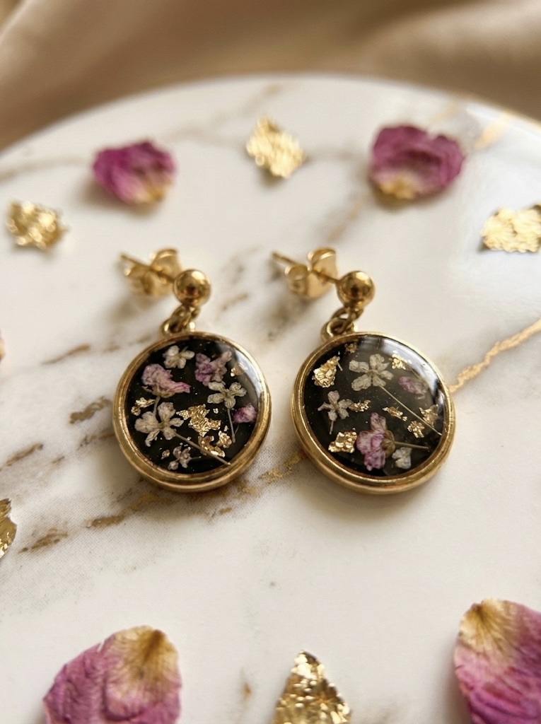 Puces noires fleurs séchées blanches et roses et feuille d’or